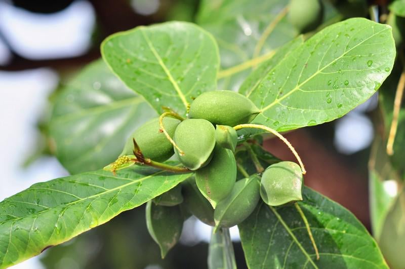 Le badamier est un arbre fruitier qui pousse dans les régions tropicales. On le trouve notamment en Asie du Sud-Est (Malaisie, Philippines, Indonésie), en Inde et aux Caraïbes. Son tronc, qui peut mesurer jusqu’à 25 m de long, est recouvert d’une écorce grise. Ses branches poussent horizontalement et portent de grandes feuilles luisantes. Il possède de petites fleurs blanches en forme d’étoile maculées de rouge ou de rose présentes toute l’année. Son fruit, ovale et charnu, contient une amande comestible. Il est vert à la naissance et devient rouge en mûrissant.