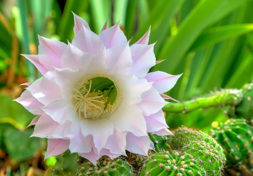 - Originaire du Mexique et des Antilles, le cactus grandiflorus est présent dans les régions méditerranéennes. Sa tige peut atteindre plus de 5 mètres de hauteur. Il possède de grandes fleurs éphémères aux pétales blancs qui mesurent plus de 30 cm de diamètre. Cette plante est souvent surnommée « reine de la nuit » et « cactus vanille » en raison de sa floraison nocturne et du parfum de vanille que ses fleurs dégagent.