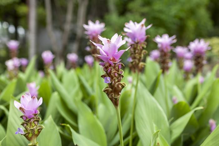 La zédoaire est une plante vivace tropicale qui pousse principalement dans les forêts humides d’Asie. Elle possède une racine ramifiée et comestible de 30 à 60 cm de long qui dégage une forte odeur proche de celle du romarin ou du gingembre. Pour cette raison, elle est parfois surnommée « gingembre bâtard ». Ses feuilles alternes se dressent vers le ciel. Elles sont vertes sur le dessus et légèrement pourpres dessous. Ses grandes fleurs, blanches à la base et violettes au sommet, apparaissent avant les feuilles. Elles sont rarement solitaires et se développent généralement en groupes (4 à 6 fleurs).