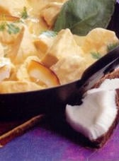 4 escalopes de poulet, 1 oignon, 4 cuillères à soupe d'huile d'olives, 1 boite de lait de coco (33cl), 2 cuillères à soupe de curry en poudre, poivre, sel, 1 cuillère à soupe de gingembre moulu.