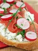 Ingrédients: 8 grosses tranches de pain complet, 12 radis, 1/2 concombre, 200g de fromage blanc à 0% de MG, 1 c. à café de moutarde, 1/2 citron, 1 c. à soupe de persil haché (frais), sel, poivre.