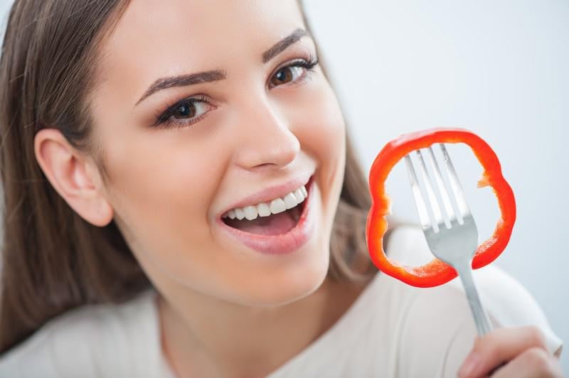gros plan, portrait, de, belle fille, vouloir, manger, frais, morceau de poivre, depuis, les, fourchette, elle, est, sourire, être, dans, anticipation, de, manger, les, girl, regarder, les, appareil photo, isolé, sur, blanc, fond