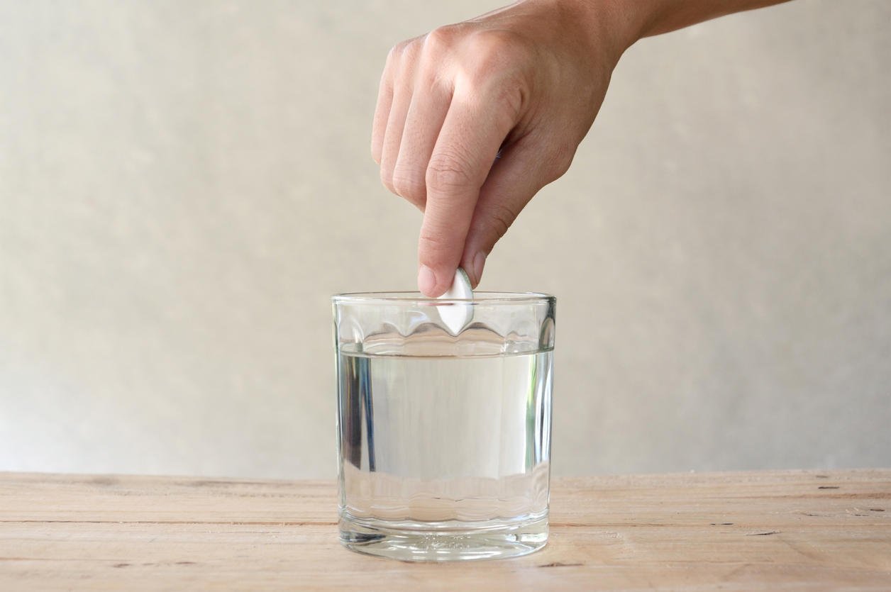 femme mettre comprimé effervescent dans le verre d'eau sur la table en bois