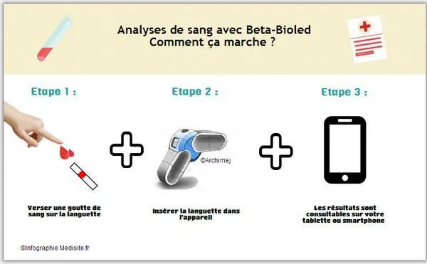 "Beta-Bioled", c'est le nom de cet appareil qui vous permettra bientôt d'analyser votre sang, chez vous. Ce système pas plus grand qu'un smartphone a été créé par la société française de biotechnologie Archimej. Il pourra analyser le taux de cholestérol, de sucre, la créatinine et une dizaine d'autres facteurs liés aux maladies rénales et cardiovasculaires.
