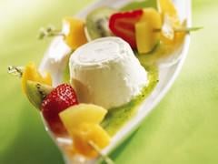 10. Démouler et verser la faisselle sur une assiette. Déposer une brochette de fruit de chaque coté de la faisselle.