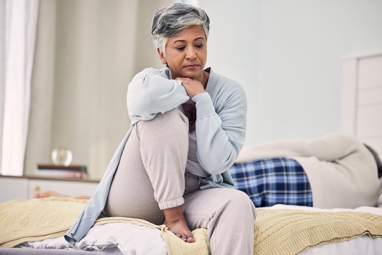 divorce, sad and senior woman with depression in bedroom or frustrated with problem or fear infidelity, marriage and fight with elderly female with stress in home or angry with partner or couple