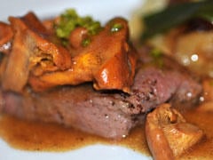 9. Couper le filet de biche en tranches fines, les mettre dans le plat de service; ajouter les girolles, arroser du jus de cuisson et servir aussitôt.