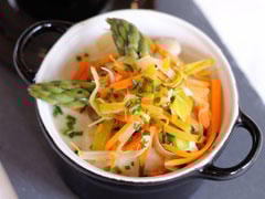 Dans un récipient allant au micro-ondes, regrouper les légumes avec les petits pois et les asperges coupées en tronçons. Saler, poivrer, ajouter 2 cuillères à soupe d’huile d’olive.