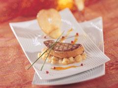 Foie gras de canard poêlé aux pommes, jus d’agrumes au Porto blanc