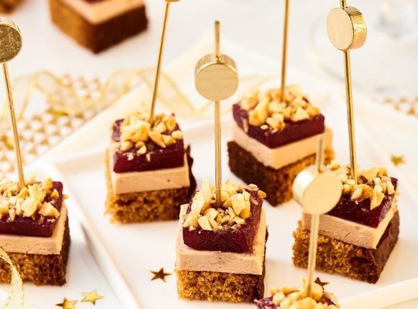 - Passer au dressage : Placer un cube de pain d’épices, puis un de foie gras, un cube de poire et dépose une touche de miel sur la surface. Parsemer de cacahuètes et piquer avec un petit pic à brochettes.
