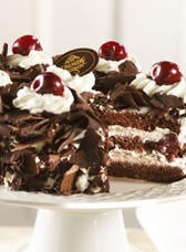 Garniture : 500 g de Cerises noires fraîches (ou en conserve au naturel), 100 ml de kirsch, 2 cuillères à café de vanille liquide, 400 ml de crème fraîche liquide, 100 g de chocolat noir à 70% en copeaux, 100 g de chocolat blanc en copeaux, 25 g de sucre glace.