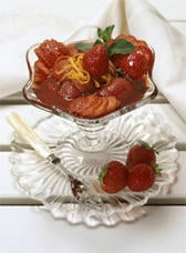 Laver les fraises sans laisser tremper. Les égoutter puis les ouvrir en deux. Faire bouillir le vin rouge, le sucre en poudre, avec les clous de girofle et les zestes d'orange. En arroser les fraises avec le vin. Laisser reposer. Servir frais.