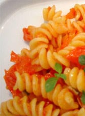 Parallèlement, faites bouillir de l'eau dans une grande casserole, pour les pâtes. Jetez les lamelles d'ail dans l'huile chaude et parfumée, et laissez-les cuire jusqu'à ce qu'elles deviennent transparentes. Dès que l'eau bout dans la casserole, plongez-y les pâtes et ajoutez 1 cuillerée à soupe bombée de gros sel. Mélangez. Lorsque l'ail est transparent, mettez les tomates dans le wok et réglez le feu au maximum. Pendant que les pâtes cuisent très al dente - 5 à 6 mn -, les tomates s'attendrissent et forment avec l'huile parfumée, une onctueuse émulsion. Salez modérément. Ajoutez, en les égouttant à demi avec une écumoire, les pâtes aux tomates. Mélangez, baissez le feu et laissez les pâtes continuer de cuire avec les tomates, à feu doux et en les tournant souvent, jusqu'à ce qu'elles soient al dente. Servez ces exquises pâtes chaudes, tièdes ou froides.