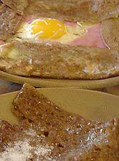 Reprendre les crêpes. Beurrer légèrement un des côtés de la crêpe. La déposer, face beurrée, dans un poêle chaude. En garnir son centre du jambon et de fromage râpé. Ajouter une cuillère à soupe de crème liquide et ciseler par-dessus quatre brins de ciboulette. Puis, casser un oeuf au centre de la galette.