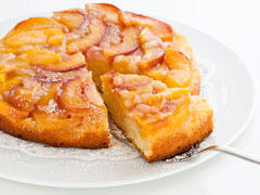 Beurrer un moule et y verser l'apareil. Disposer les tranches de pêche et enfourner 30 minutes environ.