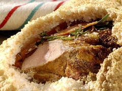 Casser la croûte de sel, découper le gigot en fines tranches. Servir dans un plat entouré de ses légumes.