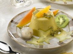 Eplucher quelques fruits de saison et fruits exotiques (mangue, mandarine, litchi...) sans abîmer leur chair. Les répartir dans chaque assiette puis y démouler les petites glaces.