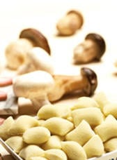500 g de cèpes, 500 g de gnocchis, 150 g de lard fumé, 100 g de parmesan râpé, 1 gousse d'ail, 25 cl de fond de veau, 10 cl de vin blanc sec, 50 g de beurre, du persil plat, 2 brins de thym, graisse de canard, sel, poivre.
