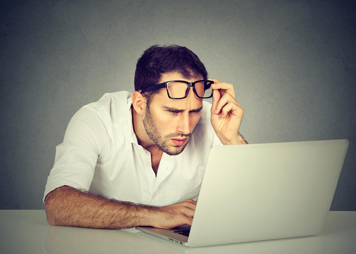 closeup portrait homme d'affaires avec des lunettes ayant des problèmes de vue confondus avec le logiciel d'ordinateur portable isolé sur fond gris vision changements liés expression du visage humain