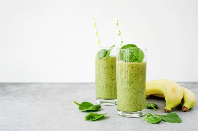Ingrédients : 160 ml de lait d’amande ou d’avoir, ½ avocat, 30 grammes de pousses d’épinards et une banane congelée.