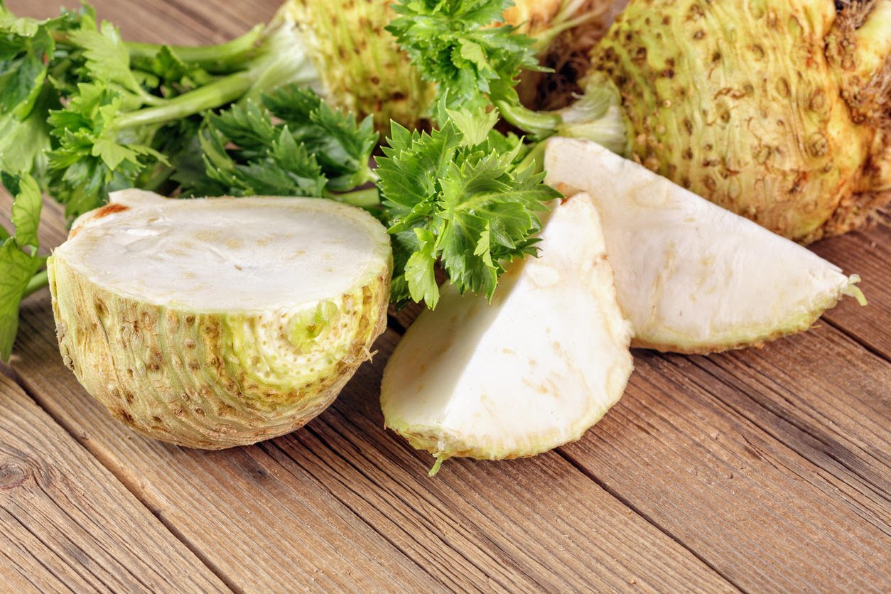 racine de céleri frais sur une planche de bois, une coupe