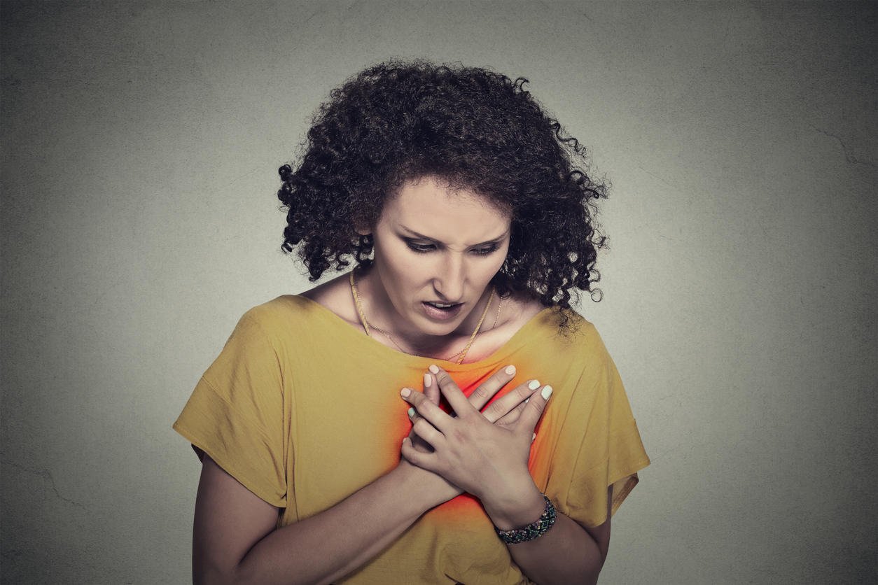 sick middle aged woman with heart attack, pain, health problem holding touching her chest colored in red with hands isolated on gray wall background human face expression