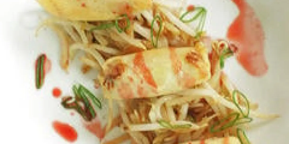 Filet de canard rôti aux pêches, subric d’épinards et pommes boulangères