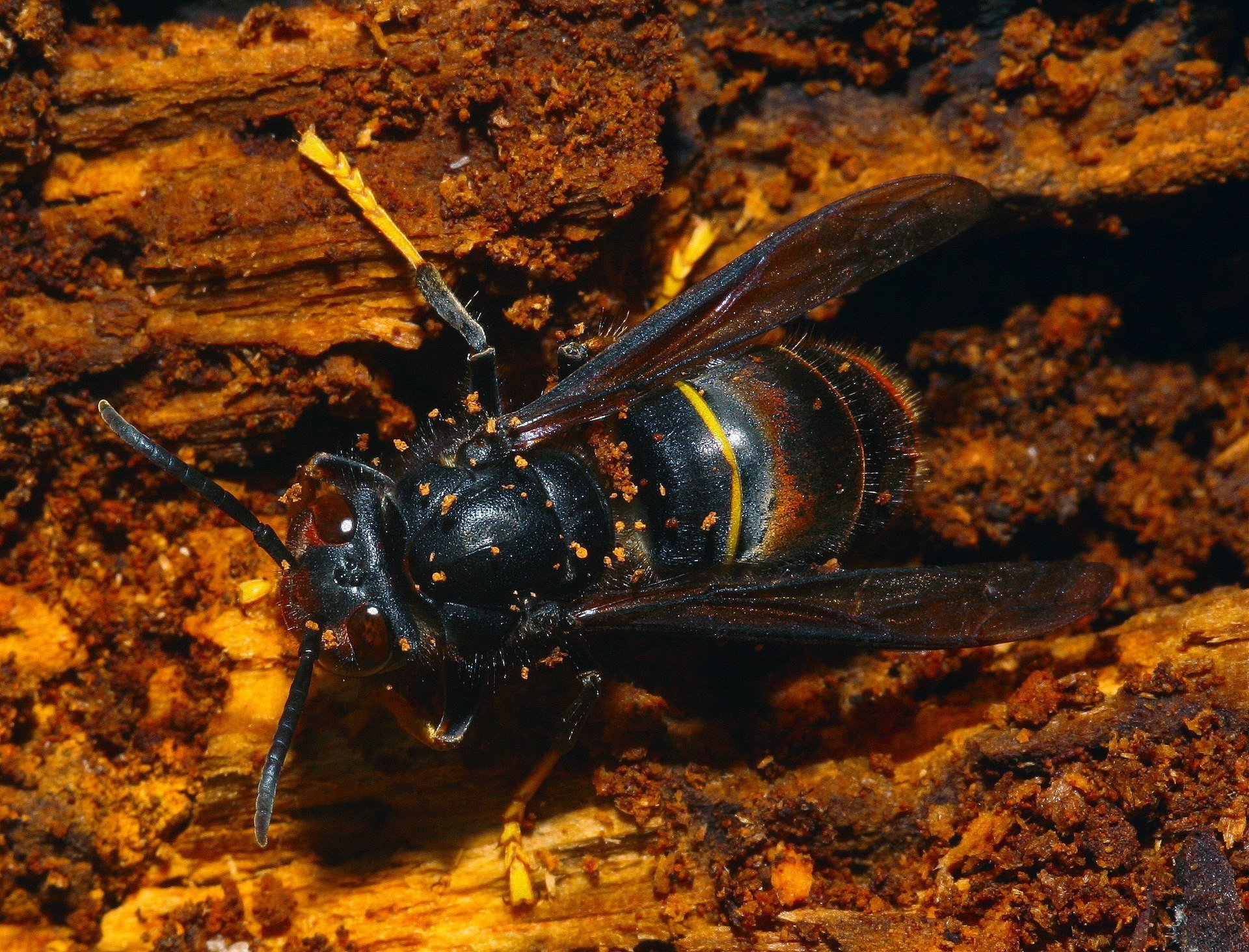 Le frelon asiatique, ou Vespa Velutina, a été introduit en France accidentellement en 2004. Il est plus petit que le frelon européen, mais beaucoup plus foncé. Ses conditions biologiques sont les mêmes que celles du frelon européen. Voici sa description :