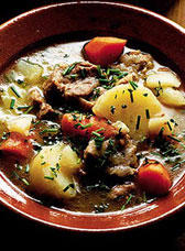 500 g de viande d'agneau maigre, 20 g d'oignons, 200g de chou blanc, 200 g de chou frisé, 200 g de haricots verts, 500 g de pommes de terre, sel, 200 g de carottes, poivre du moulin, 1 cuill. à café de cumin, 1 1/2 tasse de bouillon, 2 cuill. à soupe de beurre, 2 cuill. à soupe de persil haché
