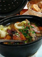 1,5 kg de bœuf dans le gîte ou la macreuse, 1 jarret de porc demi-sel, 700 g de lard de poitrine fraîche, 1 saucisson à cuire fumé, 1 petit chou, 6 carottes, 4 navets, 2 poireaux, 2 oignons, 1 branche de céleri, Clous de girofle, Thym, laurier, 500 g de farine de blé noir, 200 g de farine de froment, 100 g de beurre demi-sel, 100 g de sucre, 150 g de raisins secs, 2 œufs, 20 cl de crème fraîche, lait, sel, poivre.