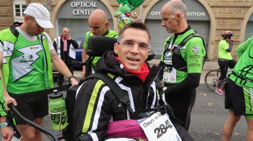 “Romain a trouvé une neurologue géniale qui a su trouver les mots justes. Elle est à la fois apaisante et rassurante. De 2014 à 2018, il faisait encore de longs séjours en hôpital mais il avait encore toute son autonomie. D’ailleurs, il a fait une course de 24 kilomètres en 2018 ! Malheureusement, la maladie a évolué petit à petit et depuis janvier 2019 il est en accueil permanent à la MAS. Aujourd’hui, 10 ans après avoir été diagnostiqué et après avoir déclaré la maladie, Romain ne marche plus, ne court plus bien sûr, ne parle plus et ne mange plus. Il a une poche d’alimentation d’1 litre/jour depuis mars 2019. Il a donc énormément maigri ! Il a toute sa tête et comprend malheureusement tout ce qu’il lui arrive, tout ce qu’il vit. C’est d’autant plus douloureux pour lui et pour nous. Le fait de ne pas comprendre ce qu’il essaye de me dire, me bouleverse à chaque fois. Fort heureusement, grâce aux différents thérapeutes qui interviennent à la MAS et à notre souhait de lui faire vivre encore le plus possible de belles émotions, Romain a pu faire récemment un vol en parapente et l’ergothérapeute prévoit au printemps un vol en ULM !”