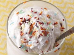 Placer au fond d'une verrine le rond d'ananas. Mettre 1 boule de glace sur l'ananas et ajouter sur le dessus les blancs en neige au chocolat.