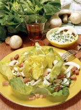 4 petites laitues, 500g de champignons de Paris, 1 tranche épaisse de jambon cuit légèrement fumé, 1 jus de citron, crème fraîche, ciboulette, sel, poivre.