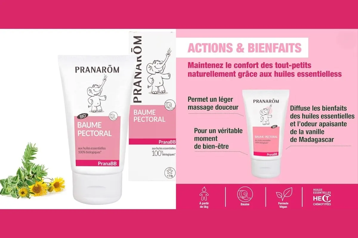 " Contient une synergie huiles essentielles choisie pour aider au bien être de bébé... Sapin baumier, marjolaine à coquille, épinette noire, inule odorante et vanille. " - Description de l'éditeur.