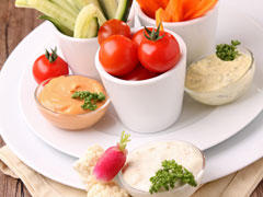 Vos sauces sont prêtes. Les servir à côté des légumes. Chacun choisit son petit légume et le tremper dans la sauce de son choix.