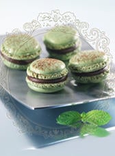 Les macarons : 7 blancs d'œufs (200 g), 50 g de sucre en poudre, 1 cuillère à café de jus de citron, quelques gouttes de colorant vert, 450 g de sucre glace, 250 g de poudre d'amande blanche, une pincée de sel