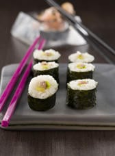 1 avocat coupé en 12 lamelles, 4 feuilles d'algue nori (disponible dans les magasins asiatiques), 4 cuillères à soupe de vinaigre de riz (si autre vinaigre, réduire la dose), 4 cuillères à café de sucre en poudre, 4 pincées de gingembre, Sauce soja et wasabi pour l'accompagnement, huile d'olive, sel et poivre.