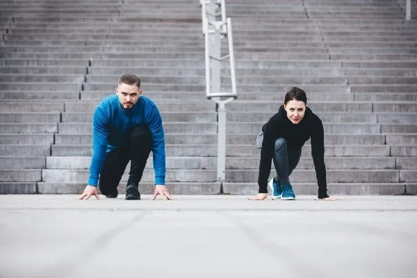 En position du sprinter au départ, pied gauche au niveau de la main gauche, genou droit posé au sol bien en arrière de la main droite.