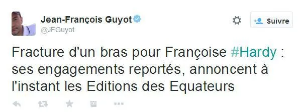 En pleine promotion pour la sortie de son dernier livre Avis non autorisée, Françoise Hardy serait contrainte de tout arrêter. Selon le tweet de Jean-François Guyot journaliste à l'AFP, sa maison d'édition Les Equateurs aurait annoncé que la chanteuse de 71 ans se serait fracturé le bras. Aucun détail n'a été donné sur les causes ou circonstances de l'accident. La chanteuse a besoin de repos pour se remettre avant de reprendre la route des plateaux de télévision, de radios et les salons où elle devait être présente.