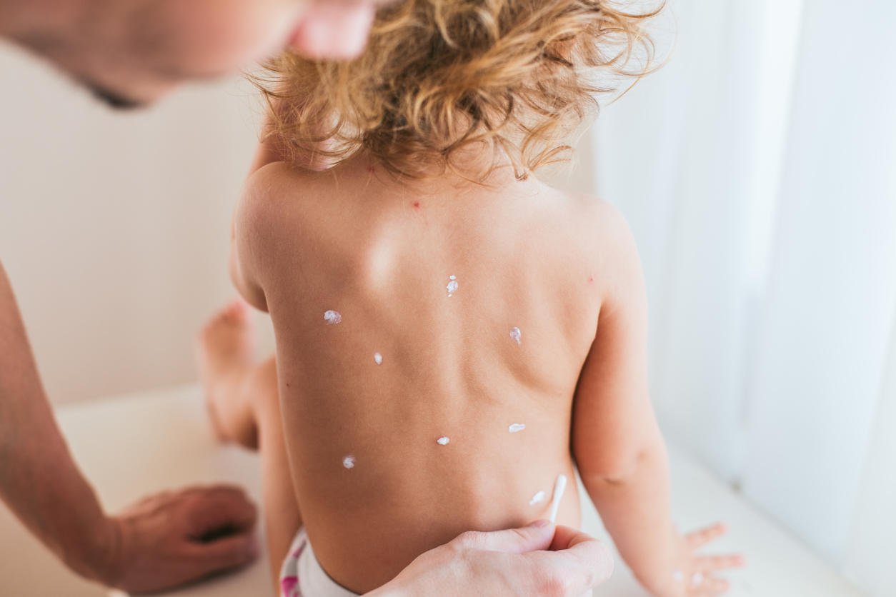 closeup of dad applying antiseptic cream on little girl with chickenpox at home
