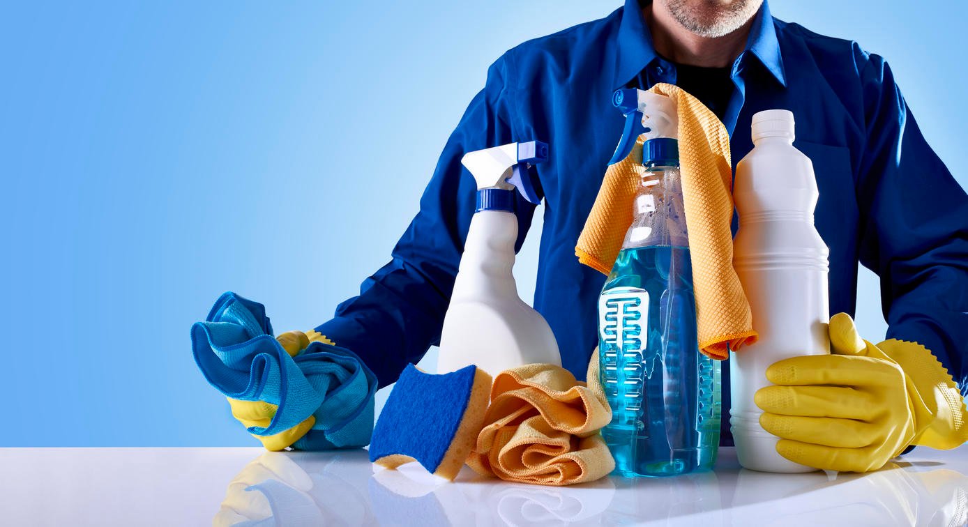 service de nettoyage avec des produits et de l'équipement sur une table blanche et la composition horizontale de devant de travailleur en uniforme