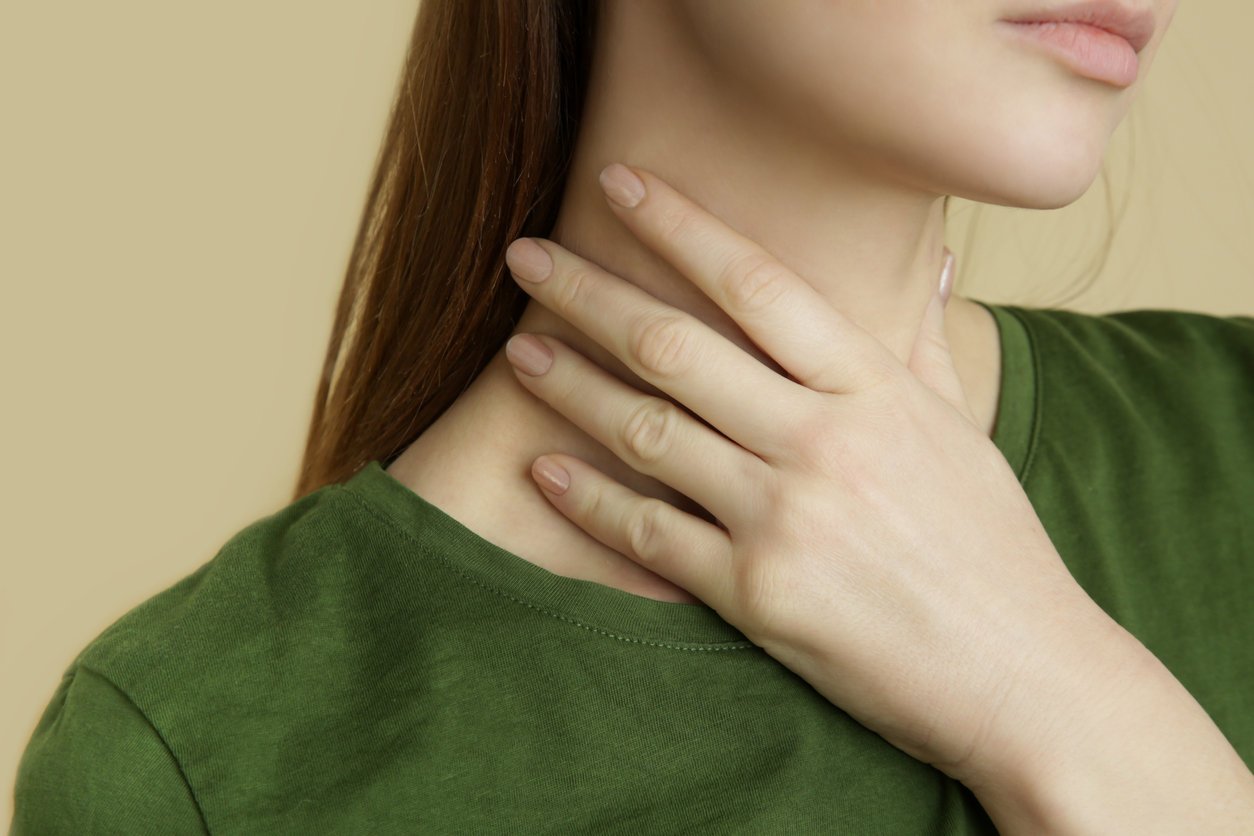 portrait of sick caucasian woman with sore throat, cold, flu or thyroid gland problem