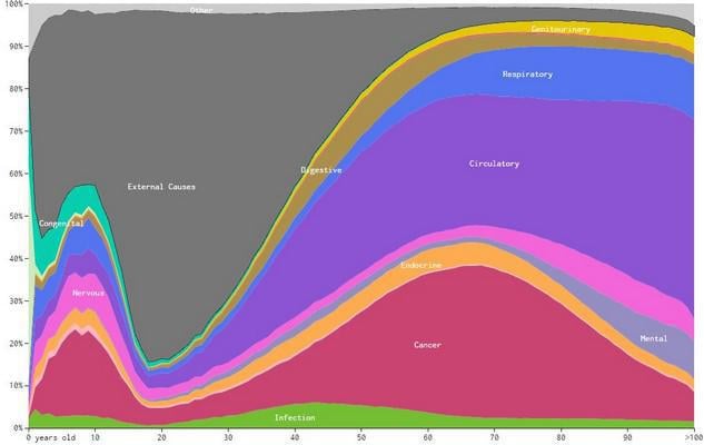 Petit bémol : les chiffres officiels concernent seulement les Américains mais donnent quand même un ordre d'idées sur la prévalence. Infections, cancers, troubles sanguins, cardiaques, du système respiratoire, maladies congénitales... les causes de mortalité, réparties en 20 catégories, sont répertoriées sur le graphique. Pour le lire il suffit de choisir le tronçon coloré qui représente la maladie. Il change de taille en fonction de la courbe de l'âge représentée sur l'axe des abscisses et de la catégorie choisie (femme, homme, race).