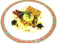 Peler les mangues et les tailler en petits cubes. Les faire revenir à la poêle dans du beurre. Les placer au centre de l’assiette. Déposer la crème pistache sur le dessus à l’aide d’une poche à douille ou d’une cuillère. Parsemer la crème de pistaches concassées. A l’aide d’une cuillère à soupe, déposer un filet de coulis autour des mangues. Placer la tuile contre la crème.