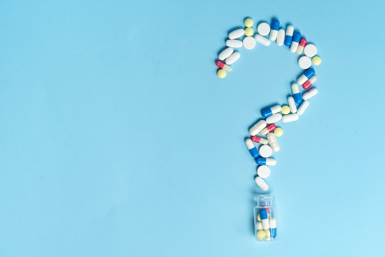 treatment and healthcare concept top view and flat lay of question mark making with different pills, tablets and glass bottle on blue background with copy space