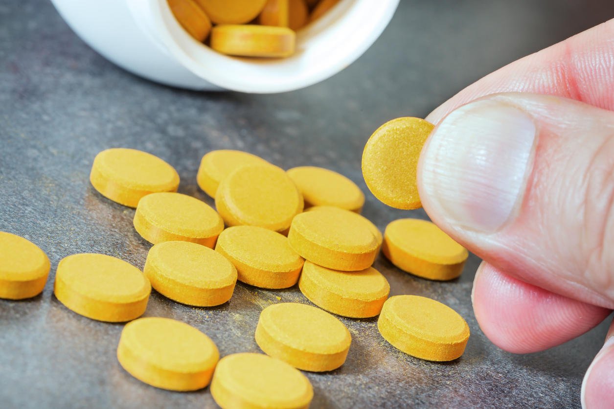 closeup on turmeric tablets, a natural food supplement with multiple virtues
