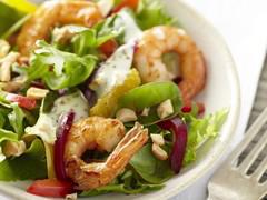 6. Dresser la salade et les légumes dans des bols, puis ajouter les crevettes, la sauce au yaourt, et finir par les noix de cajou concassées. Servir sans attendre.