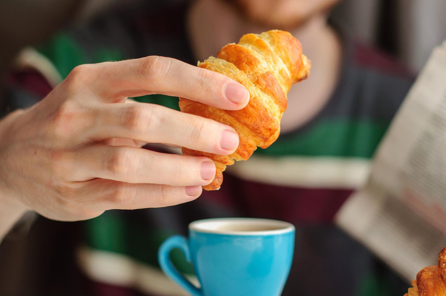 flou jeune homme mange son petit déjeuner, café, croissant et lit le journal