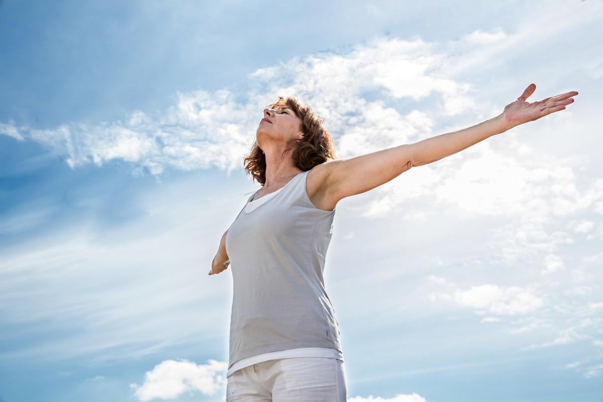 breathing outside - zen middle aged yoga woman opening up her chakra with arms raised,practicing meditation for freedom over summer blue sky,low angle view