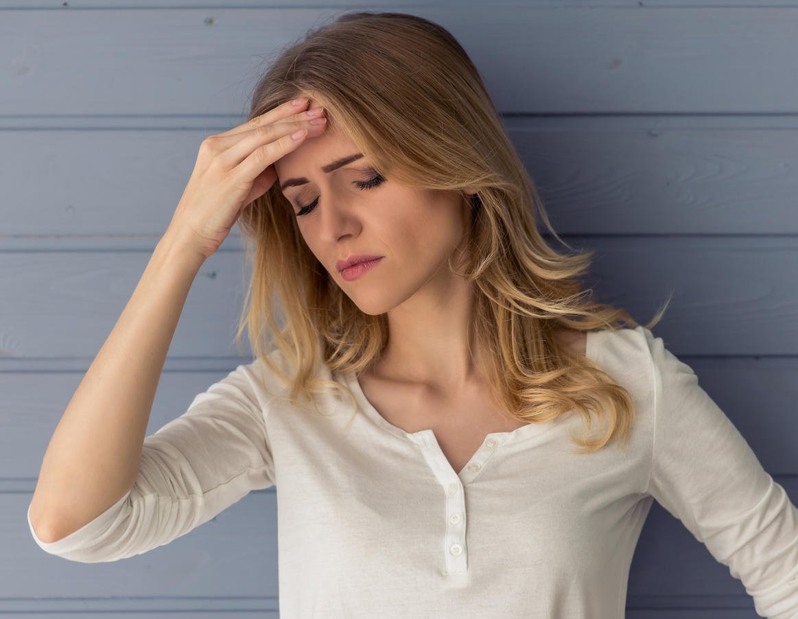 portrait de la belle jeune femme fatiguée ayant des maux de tête, gardant les mains sur la tête, contre le mur gris